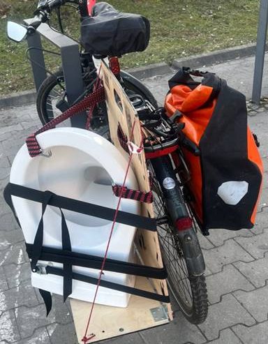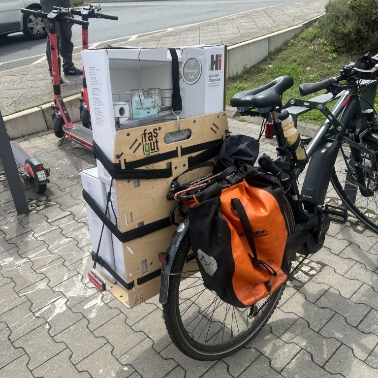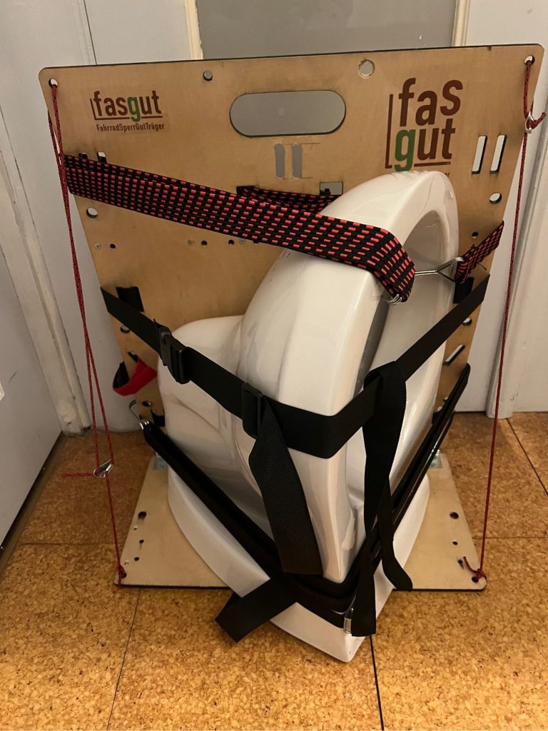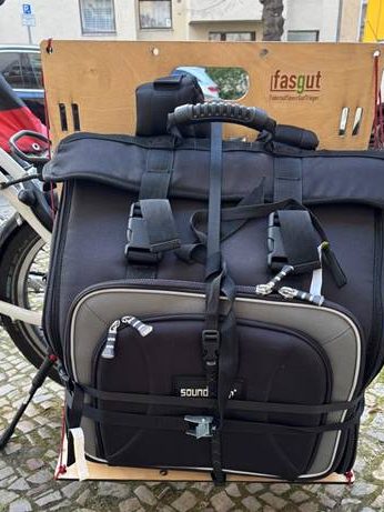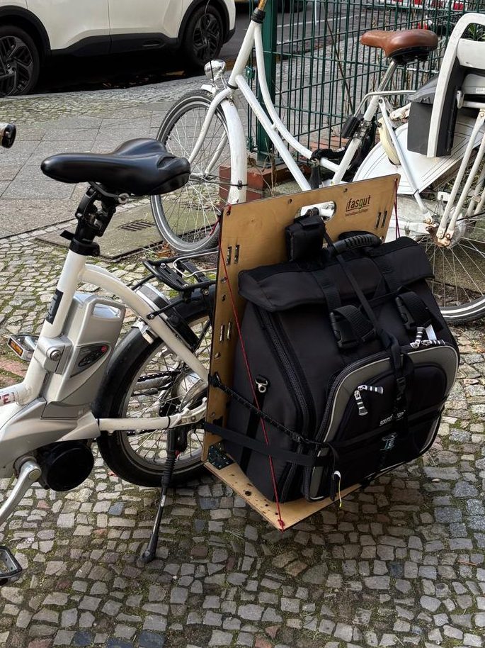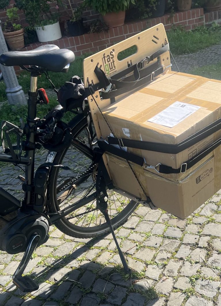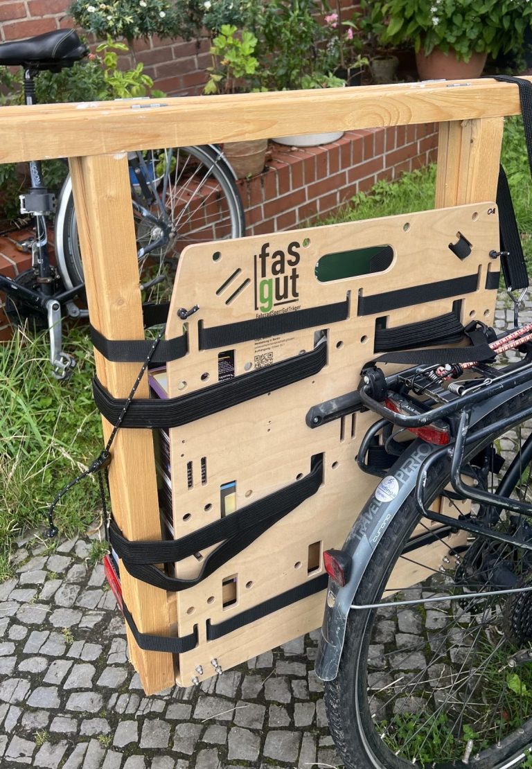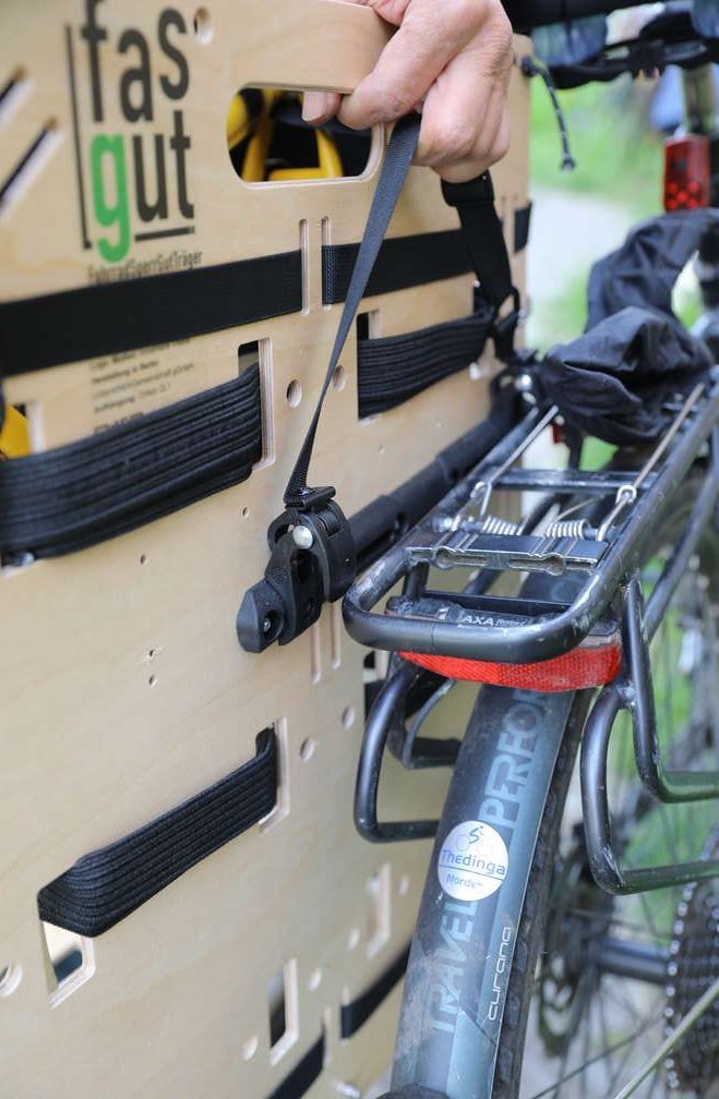 fasgut® wird wie eine Packtasche von Ortlieb® mit deren QL1-Aufhängung an den Fahrradgepäckträger gehängt. Transportiert werden mit fasgut sperrige Gegenstände, z.B. große Pakete, Leitern, Platten, Kleinmöbel, Sanitärkeramik, SUP-Packsäcke mit Paddel, Angelausrüstung, Gartenerde, Weihnachtsbäume, Koffer usw., die das zulässige Gewicht überschreiten. (für die Ortlieb®-QL1- wird 10 kg Nutzlast angegeben).