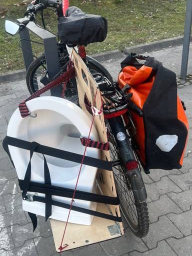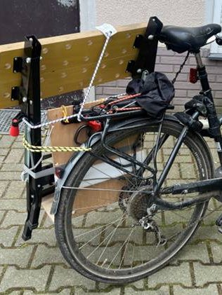 Ich hatte solche selbstgebauten Transportvorrichtungen schon ein paar Jahre benutzt (s. Fotos) und mich gewundert, dass es sowas Praktisches nicht zu kaufen gibt. Denn ich konnte damit häufig für Transporte auf meinen Fahrrad-Lastenanhänger verzichten. (Und auf ein Kfz ohnehin.)
