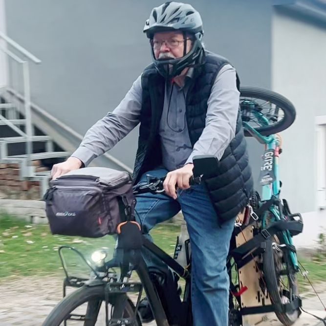 Zwei fasgut können beidseitig an einen Gepäckträger gehängt werden. Für einen fasgut wird die linke Seite empfolen.