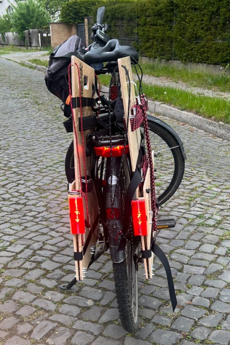 Die verwendeten Materialien sind Sperrholz (also mit Leimanteil), Metall und etwas Plastik für das LED-Rücklicht und die Ortlieb-QL1 -Aufhängung.