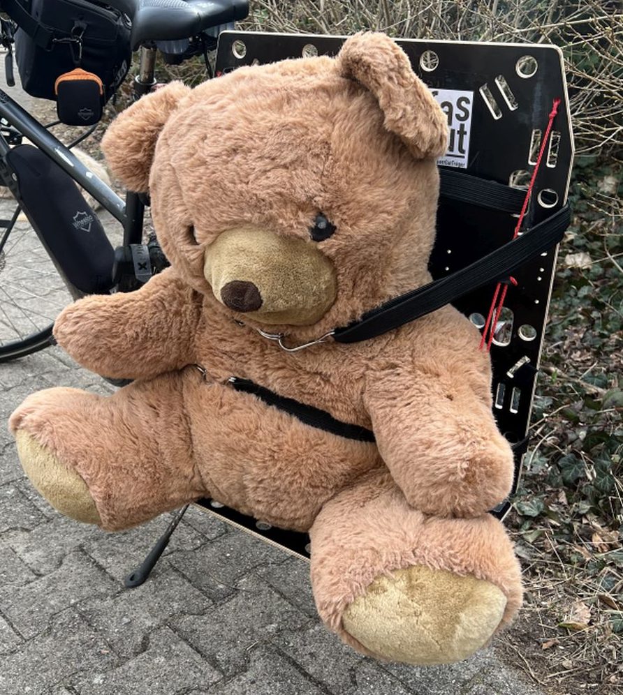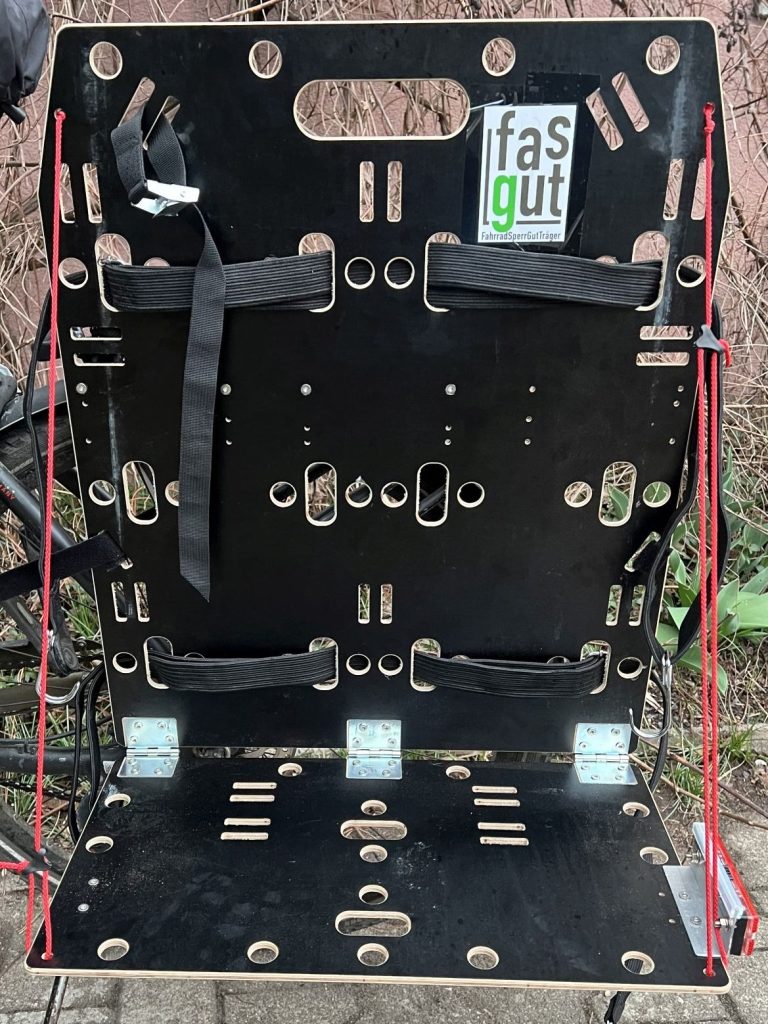 Zwei fasgut können beidseitig an einen Gepäckträger gehängt werden. Für einen fasgut wird die linke Seite empfohlen.